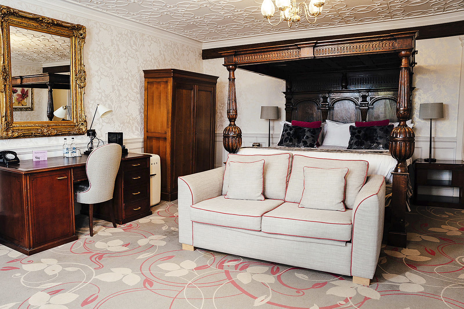 There’s plenty to drink in once you’ve arrived, too: atmospheric Arthurian-myth stained glass, elegant formal gardens perfect for strolling and a timeless, wood-panelled dining room, where pan-fried hake and courgette tastes somehow more noble than it would elsewhere. The bedrooms are just as characterful: some boast vast, carved four-poster beds that creak with history; others lean contemporary, particularly in their glossy bathrooms, which happily deliver rainfall showers rather than tin baths and chamber pots. The mix works, giving you the romance of a country-house stay with the comfort of modern convenience.